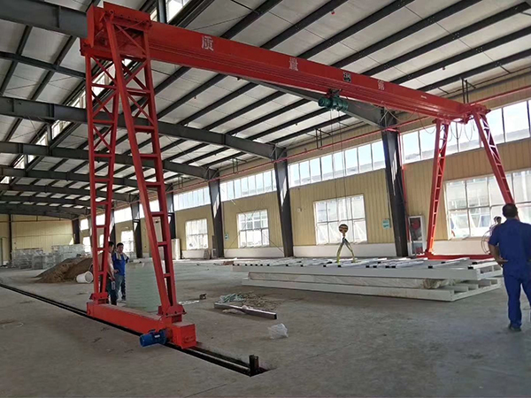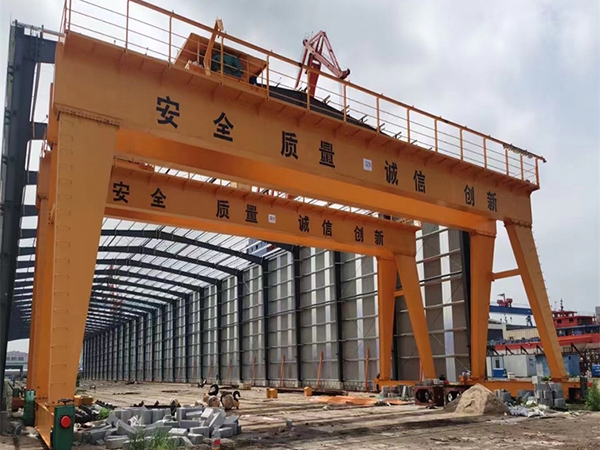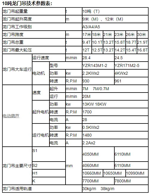 按用途形式一、普通龍門起重機軌道門式起重機這種起重機多采用箱型式和桁架式結構,用途最廣泛??梢园徇\各種成件物品和散狀物料,起重量在100噸以下,跨度為4~39米。用抓斗的普通門式起重機工作級別較高。普通門式起重機主要是指吊鉤、抓斗、電磁、葫蘆門式起重機,同時也包括半門式起重機。二、水電站龍門起重機主要用來吊運和啟閉閘門,也可進行安裝作業。起重量達80~500噸,跨度較小,為8~16米;起升速度較低,為1~5米/分。這種起重機雖然不是經常吊運,但一旦使用工作卻十分繁重,因此要適當提高工作級別。三、造船龍門起重機用于船臺拼裝船體,常備有兩臺起重小車:一臺有兩個主鉤,在橋架上翼緣的軌道上運行;另一臺有一個主鉤和一個副鉤,在橋架下翼緣的軌道上運行,以便翻轉和吊裝大型的船體分段。起重量一般為100~1500噸;跨度達185米;起升速度為 2~15米/分,還有0.1~0.5米/分的微動速度。四、集裝箱龍門起重機用于集裝箱碼頭。拖掛車將岸壁集裝箱運載橋從船上卸下的集裝箱 軌道龍門吊運到堆場或后方后,由集裝箱龍門起重機堆碼起來或直接裝車運走,可加快集裝箱運載橋或其他起重機的周轉。可堆放高3~4層、寬6排的集裝箱的堆場,一般用輪胎式,也有用有軌式的。集裝箱龍門起重機與集裝箱跨車相比,它的跨度和門架兩側的高度都較大。為適應港口碼頭的運輸需要,這種起重機的工作級別較高。起升速度為8~10米/分;跨度根據需要跨越的集裝箱排數來決定,最大為60米左右相應于20英尺、30英尺、40英尺長集裝箱的起重量分別約為20噸、25噸和30噸。